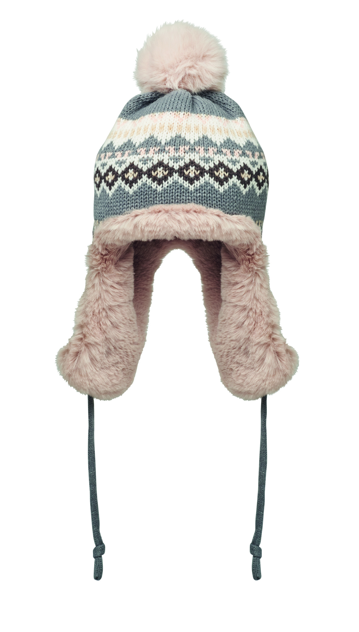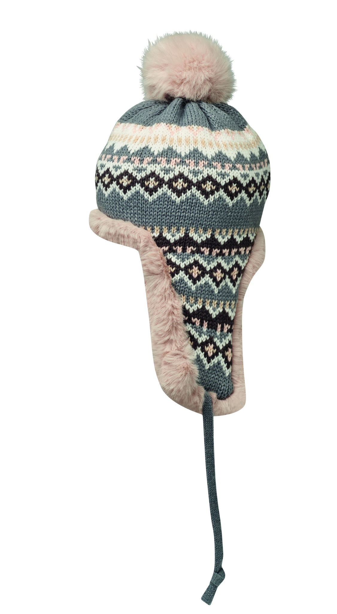 Knitted beanie with ear flaps and pompom in acrylic fibre with polyester and fleece lined. Includes label for printing area on one side. Adult size.