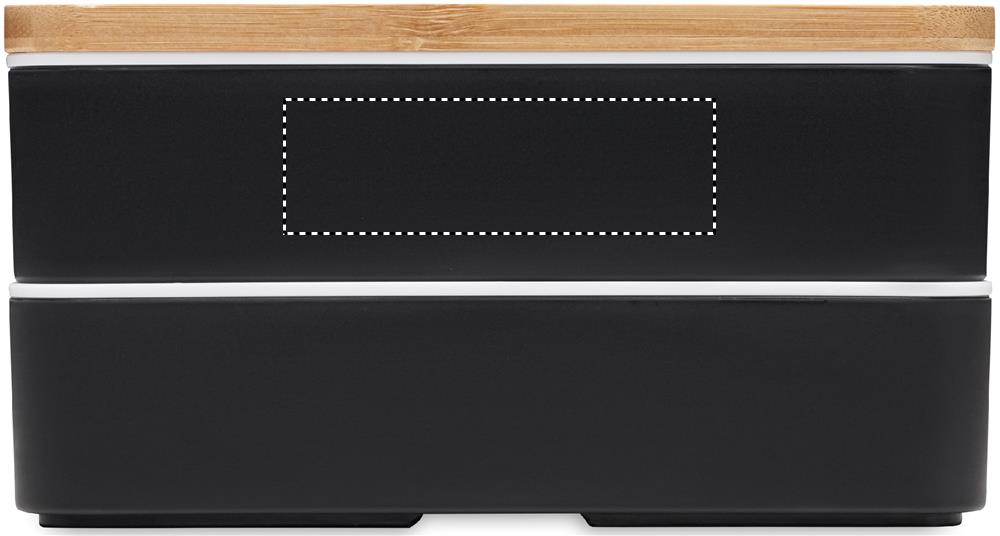Двухуровневый ланч-бокс из переработанного полипропилена со съемным разделителем, 3 столовыми приборами и бамбуковой крышкой с прикрепляемой полиэстеровой лентой. На крышке имеется подставка для телефона. Вместимость: 400 мл (2x).