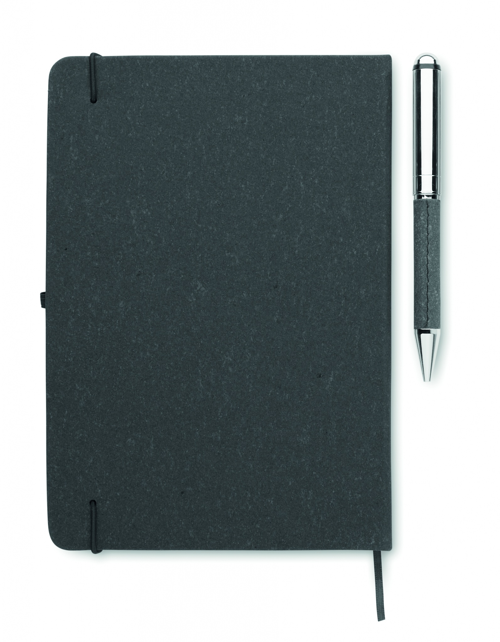 Подарочный набор: блокнот А5 в твердой обложке из переработанной кожи (75%) в переплете (160 линованных страниц (80 листов), эластичный ремешок, закладка и держатель для ручки) и металлическая ручка (синие чернила). Поставляется в крафтовой коробке.