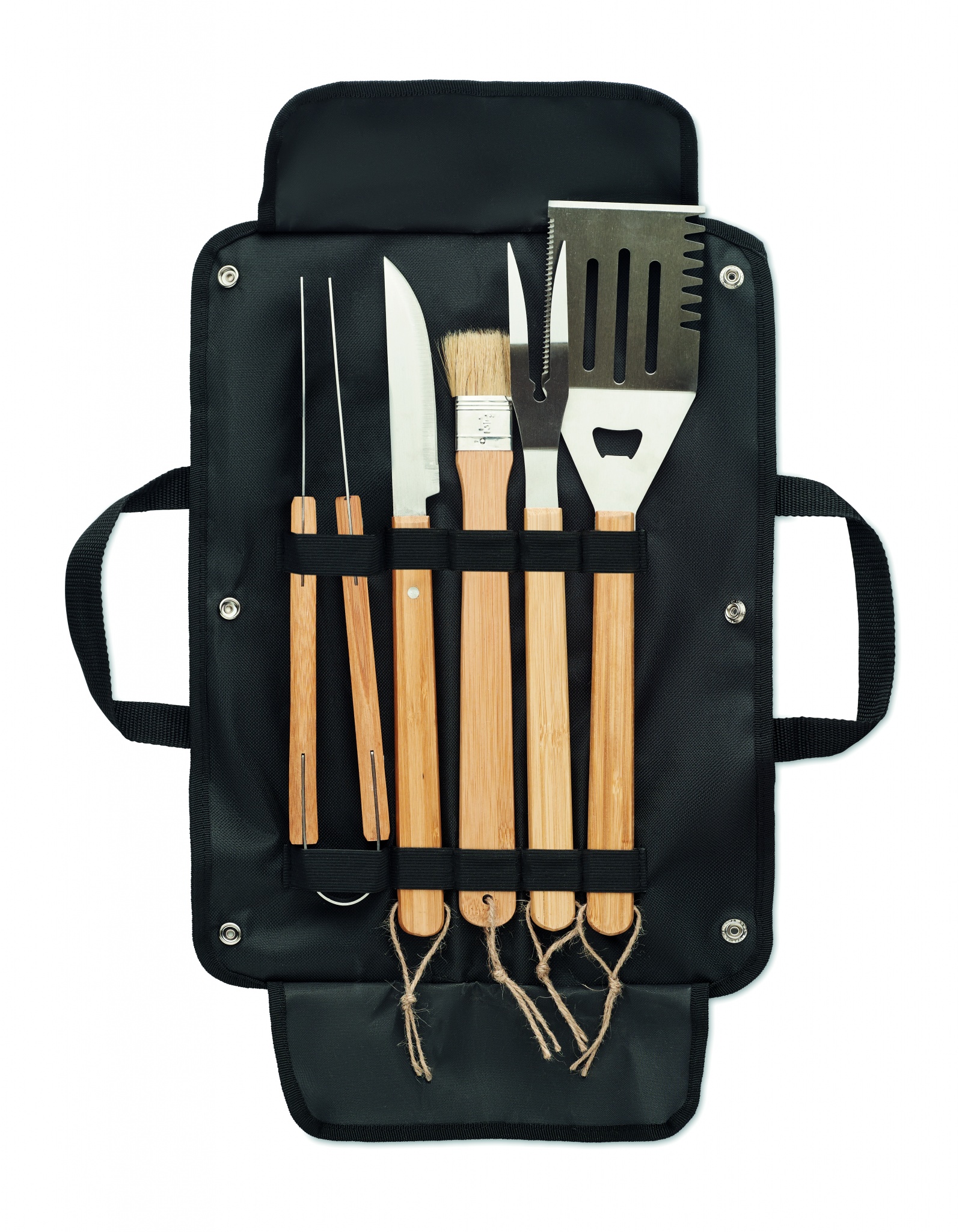 Набор инструментов для барбекю 5 предметов из нержавеющей стали с бамбуковой ручкой в холщовом чехле. Включает лопатку, нож, щипцы, вилку и кисточку для жарки.