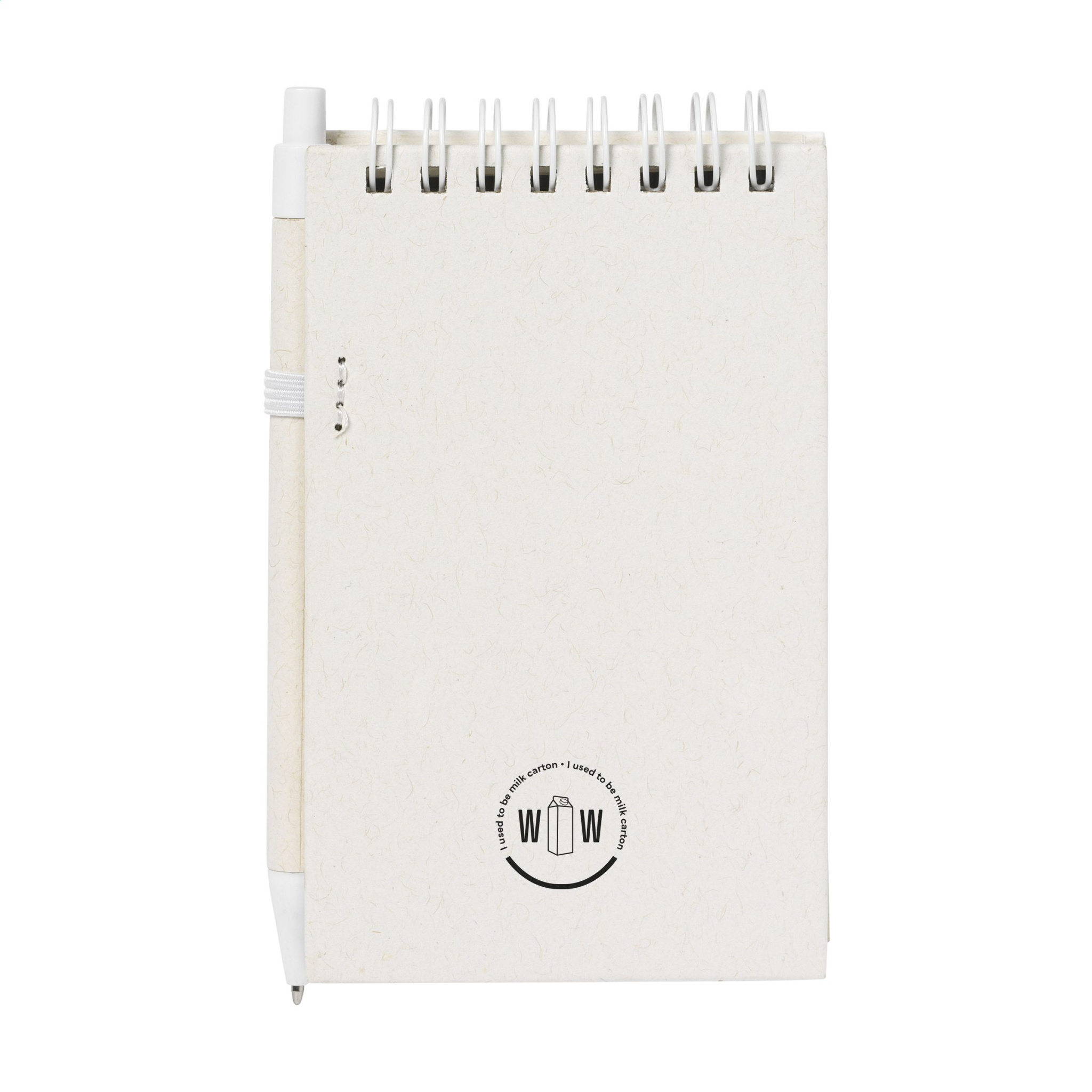 WoW! Блокнот формата А6, обложка и бумага которого изготовлены из остатков бумаги из переработанных молочных пакетов (до 70%) и 30% переработанной бумаги. Блокнот имеет кольцевой переплет и содержит около 70 листов/140 страниц кремовой переработанной линованной бумаги (80 г/м²). В комплект входит соответствующая синяя шариковая ручка, изготовленная из переработанных молочных пакетов. Из-за использования переработанных материалов могут быть видны небольшие дефекты материала. Это придает изделию уникальный вид.