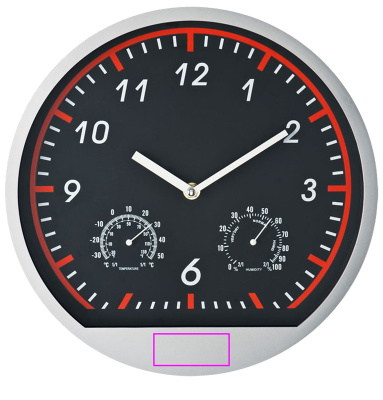 Настенные часы в классном спортивном дизайне. Часы имеют термометр и гигрометр. Мы печатаем ваш логотип на рамке под шестеркой. Без учета одной батарейки АА (закажите ее сразу, см. последнюю страницу или артикул 999300).