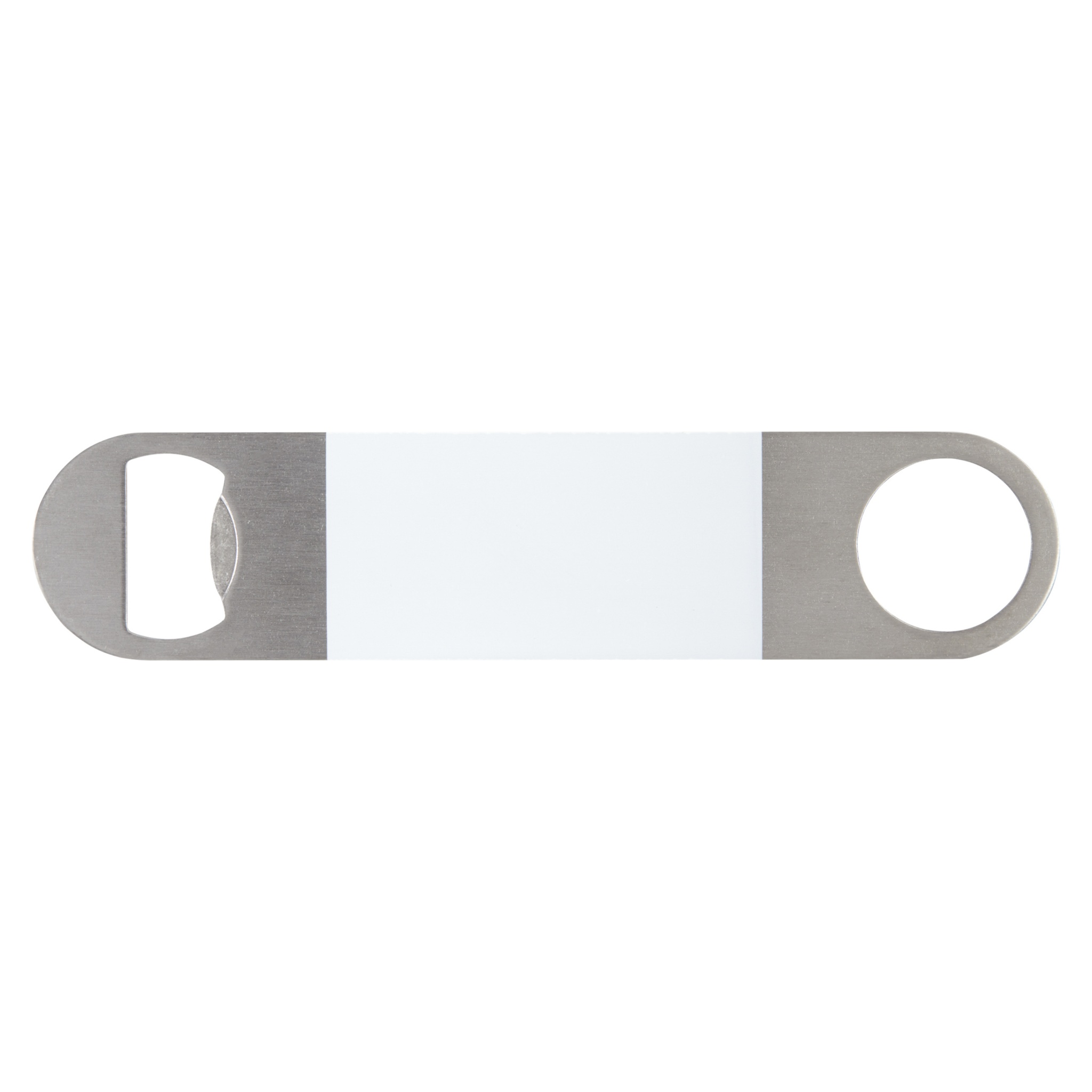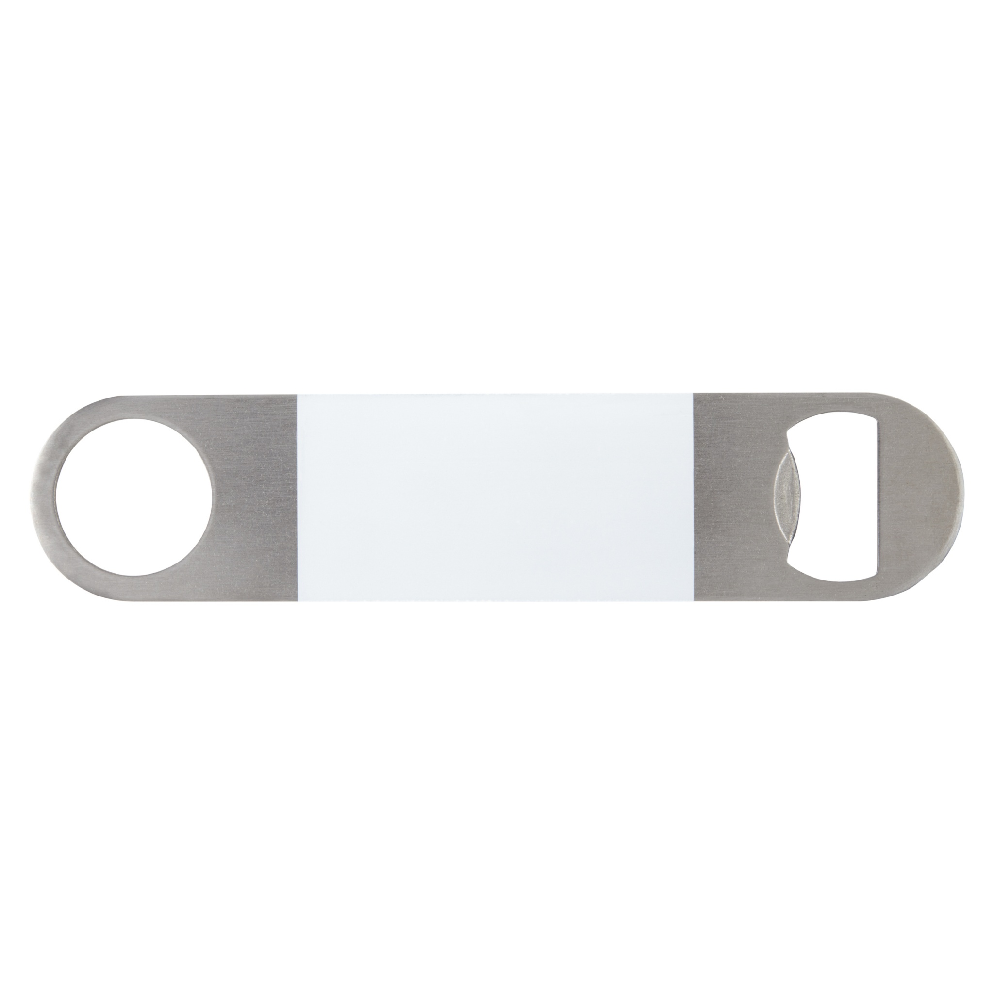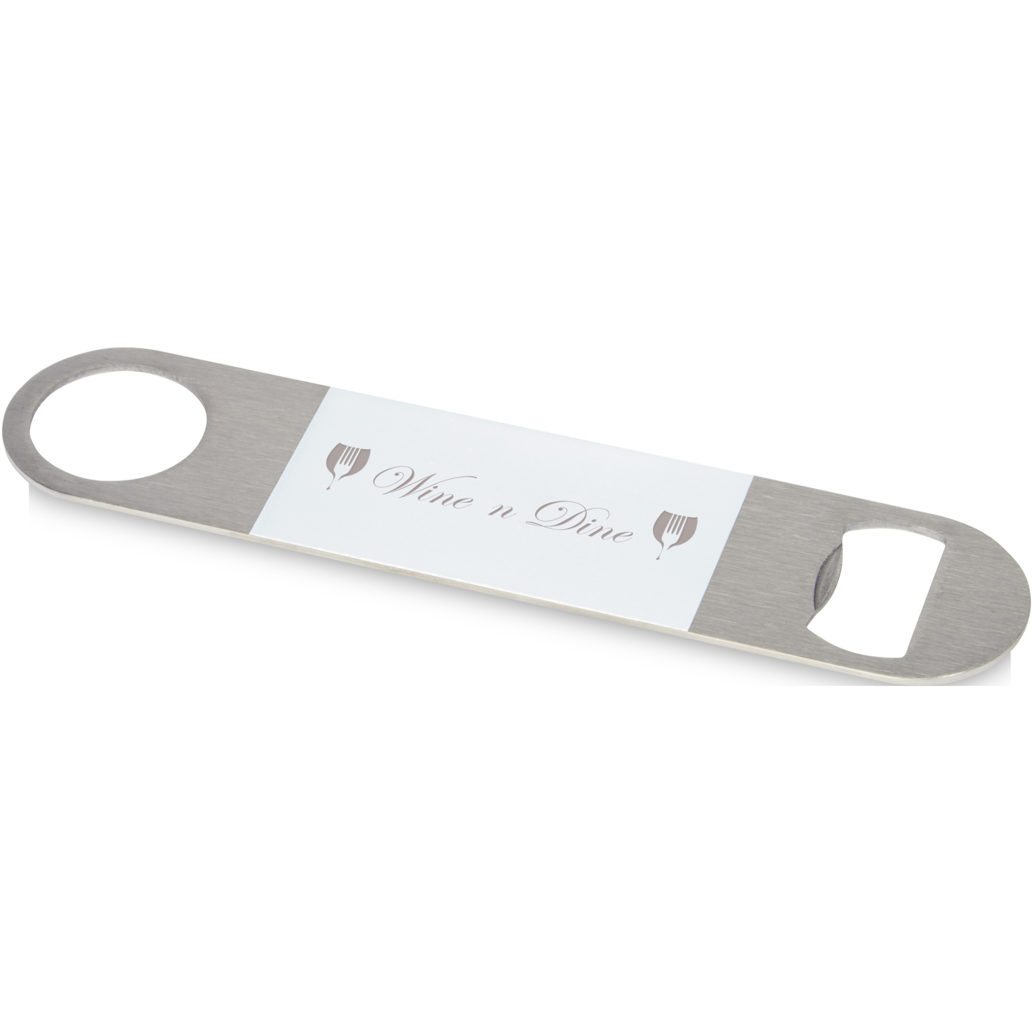 Открывалка для бутылок из нержавеющей стали с большой цветной областью в центре.