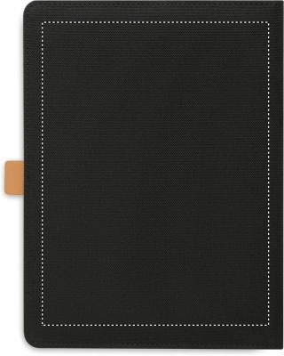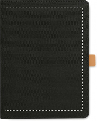 Папка формата А5 из RPET с деталями из искусственной кожи. Сменный блокнот формата А5 в твердой пробковой обложке и переплете. 128 линованных страниц из переработанной бумаги (64 листа). Держатель для ручки. 2 отделения для визиток и одно большое отделение. Эластичный ремешок с металлическими деталями.