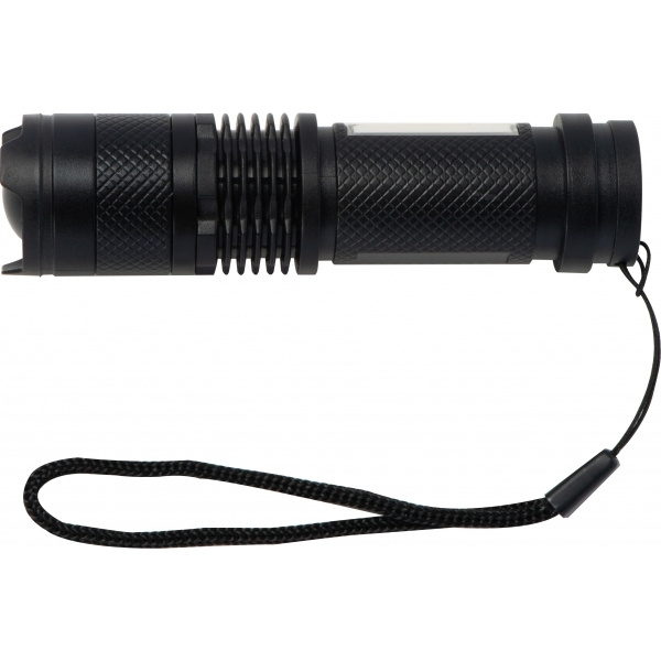 Перезаряжаемый пластиковый фонарик COB с двумя различными режимами света (обычный и мигающий), а также регулируемым фокусом и еще одной лампой на ручке. В комплекте кабель для зарядки (порт USB-USB-C).