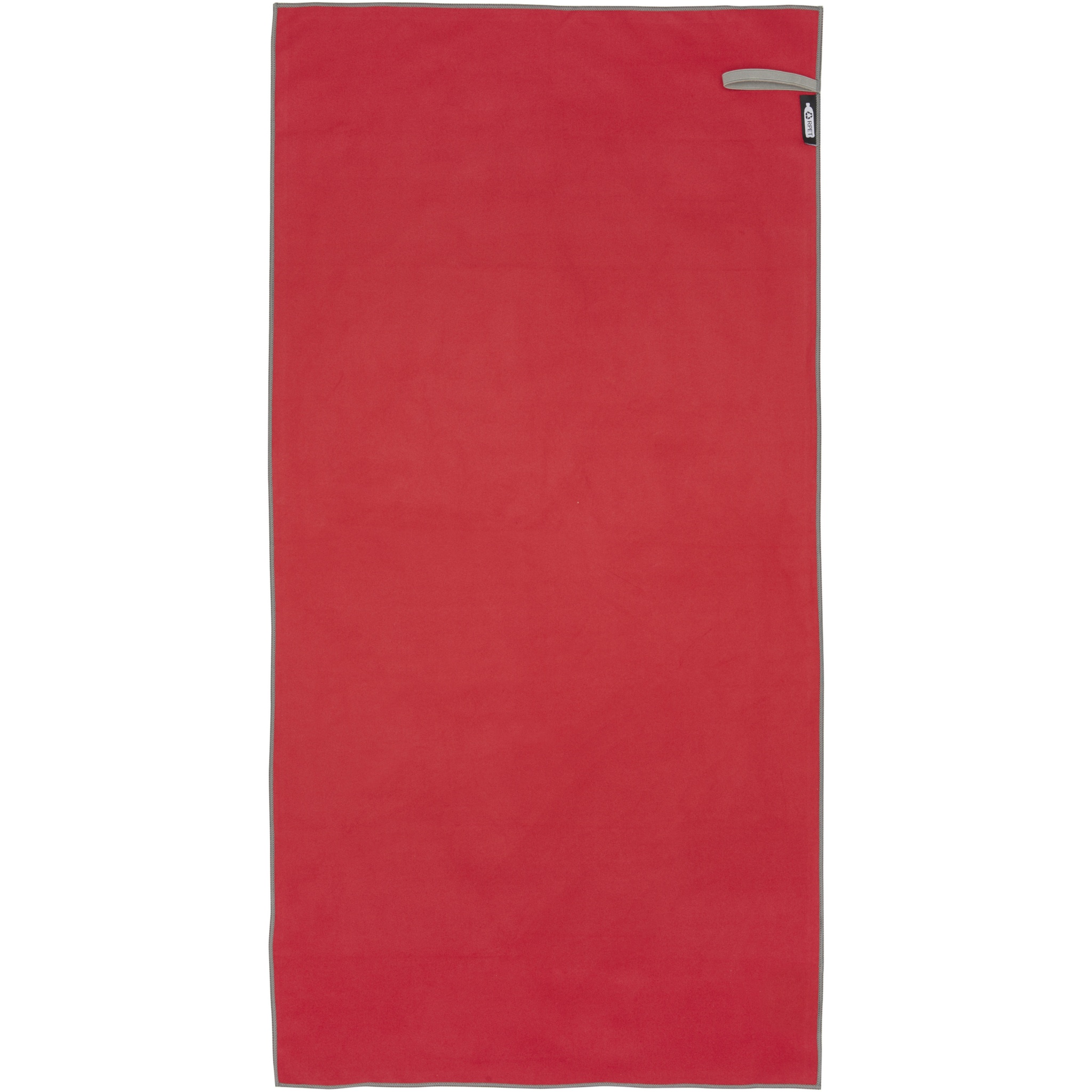 Спортивное полотенце Pieter очень хорошо впитывает влагу, легкое, быстро сохнет, а ткань прочная и очень мягкая. Когда полотенце сложено и закреплено резинкой, оно уменьшается до небольшого размера, поэтому его удобно брать с собой в тренажерный зал, бассейн, на пешую прогулку или в поход. Полотенце размером 50 х 100 см изготовлено из 90 % переработанного полиэстера GRS и 10 % нейлона. Его можно стирать в стиральной машине при температуре 40 °C. В комплект поставки входит мешок для хранения (17 x 13 см), изготовленный из переработанного ПЭТ-пластика, обеспечивающий большую площадь для печати логотипа.