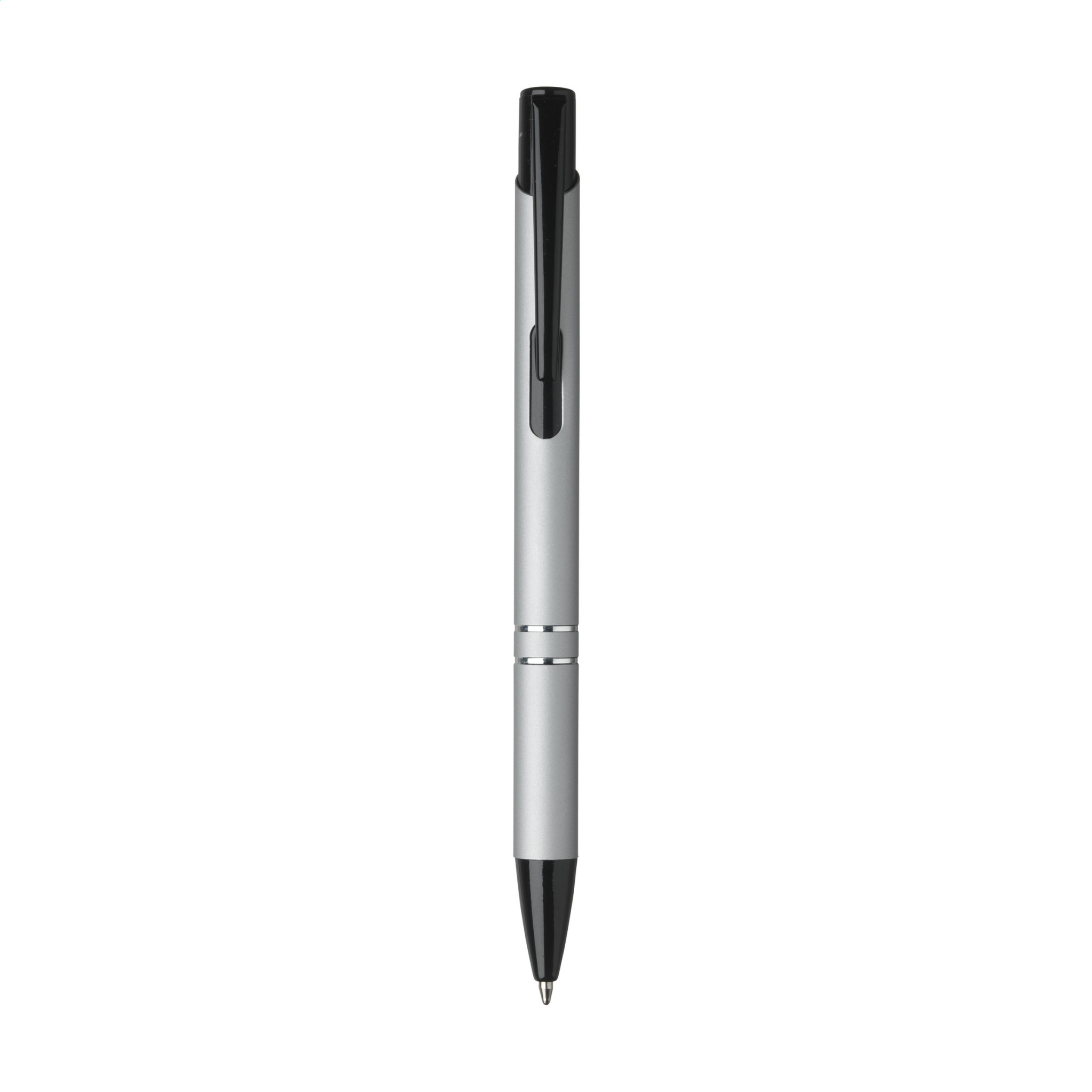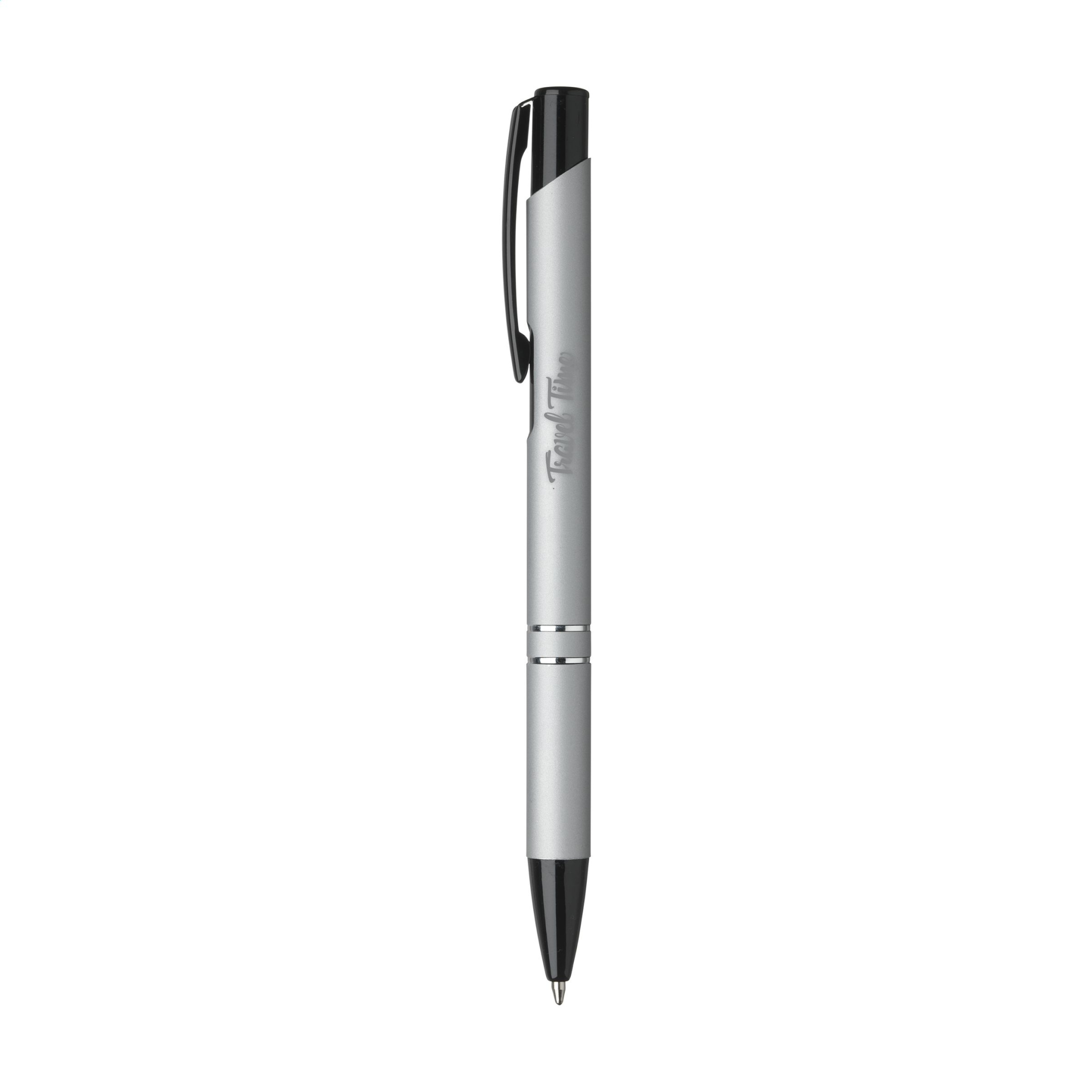 Шариковая ручка с синими чернилами, с черной кнопкой/клипсой и наконечником, хромированные вставки. Корпус отделан резиновым покрытием.