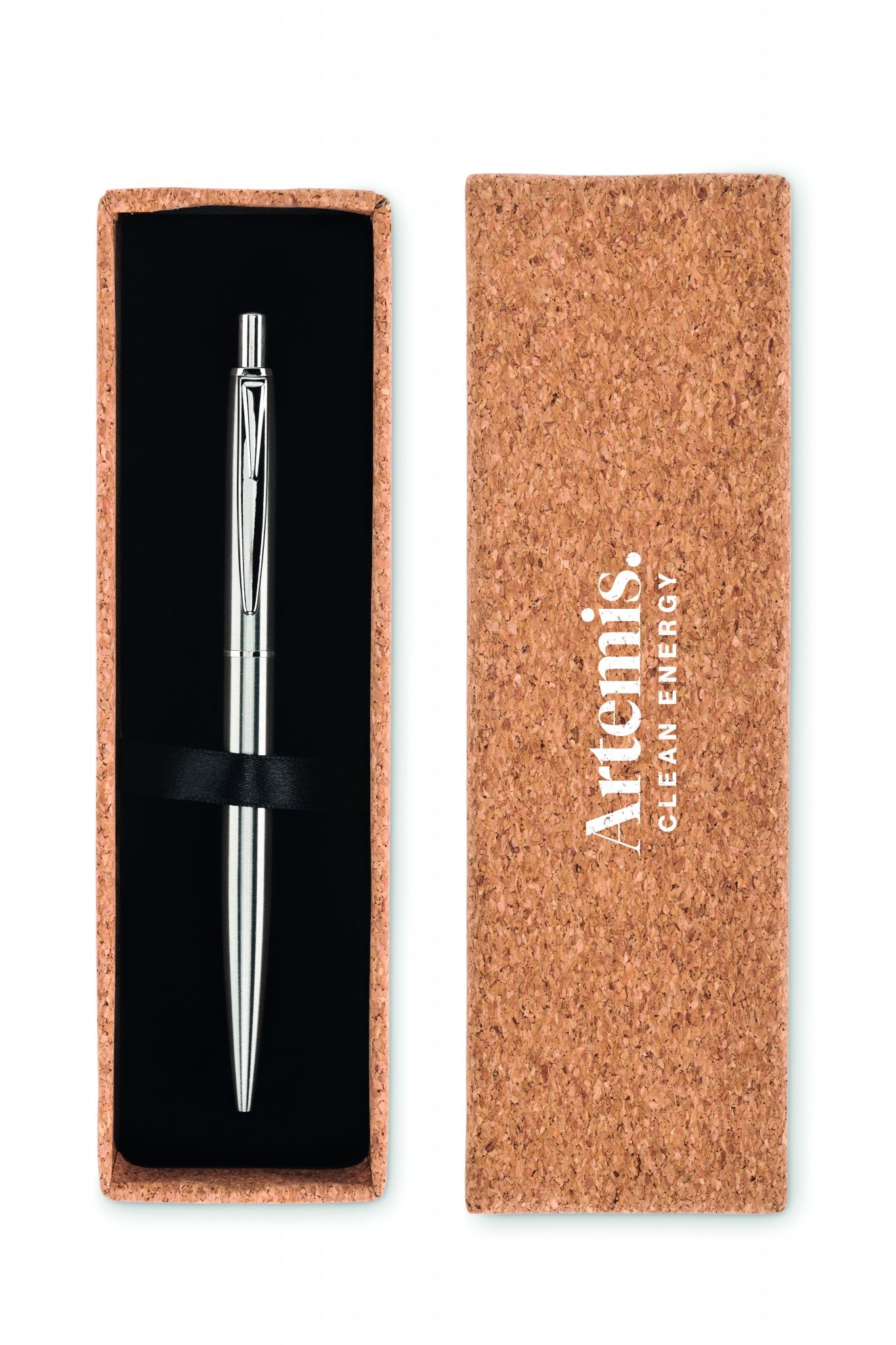 Кнопочная шариковая ручка со стержнем из переработанной нержавеющей стали. Поставляется в пробковой коробочке. Синие чернила.