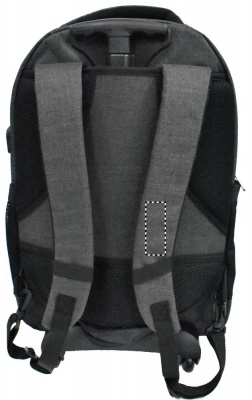 Рюкзак на колесах. Выполнен из непромокаемого материала.Внутри отделение для ноутбука, внешний карман на молнии. Чтобы не испачкать спину, в дополнительном кармане находится ткань для закрывания колес.