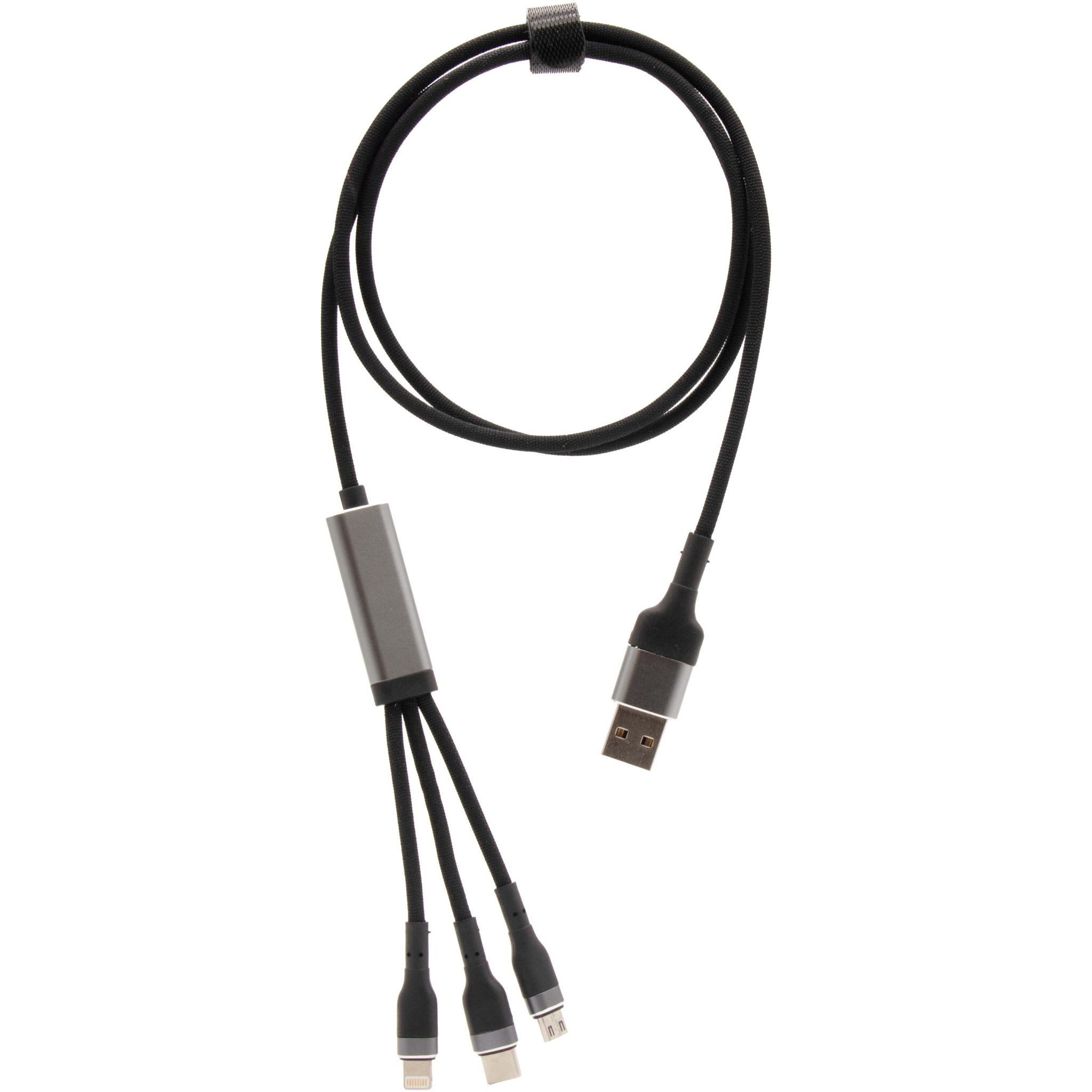 Кабель для сверхбыстрой заряжки 5-в-1, изготовленный из rPET, мощностью 100 Вт, которым можно заряжать смартфоны, планшеты и ноутбуки. Двойной вход USB-A + USB-C делает кабель на 100% совместимым с новейшими моделями компьютеров. Выходная мощность: Type-C, Micro USB и Lightning. Поставляется с чехлом из перерабатываемого TPU и вкладышем, напечатанным на переработанной бумаге. Длина кабеля: 1 метр