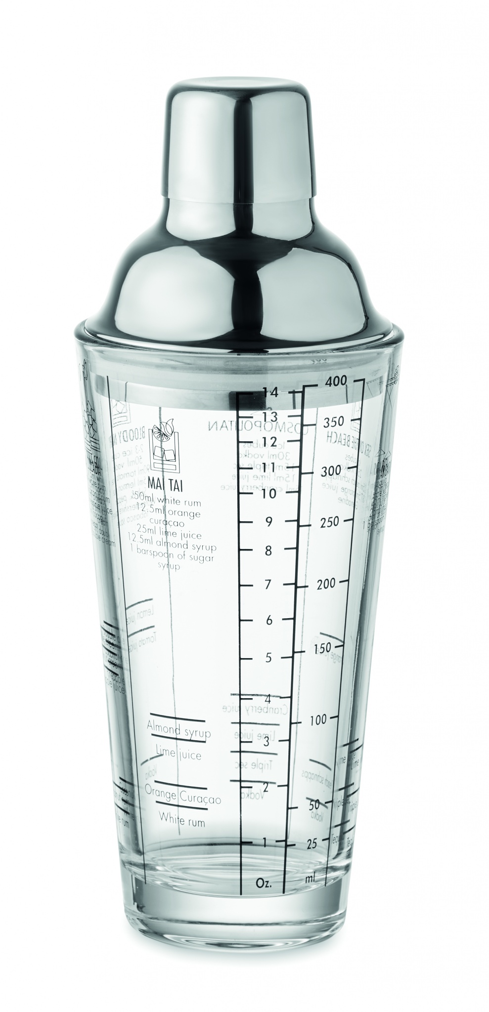 Стеклянный шейкер для коктейлей с крышкой из нержавеющей стали и ситечком. Печатные рецепты коктейлей и мерки на стакане. Емкость: 400 мл.