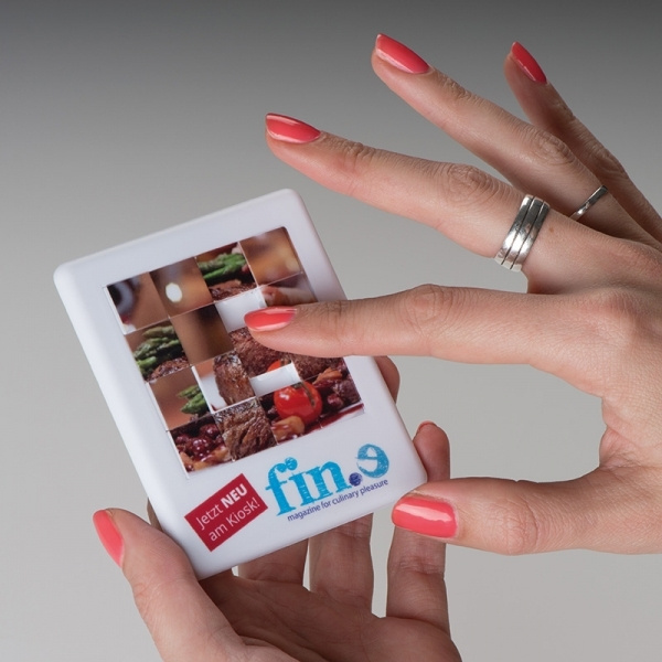Пластиковая раздвижная головоломка с 15 деталями и стопором. Мы напечатаем ваш логотип по всей поверхности с помощью цифровой печати.