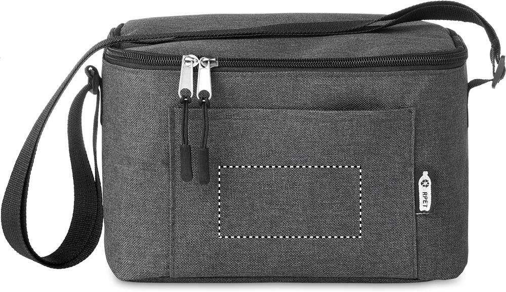 Сумка холодильник с фронтальным карманом на 6 банок в двухцветном RPET 600D. Изоляционный материал: ПЭВА 0,15 мм + пена 3 мм.