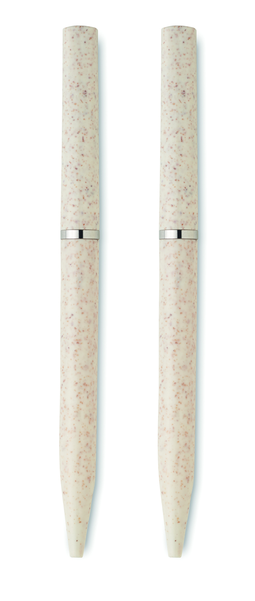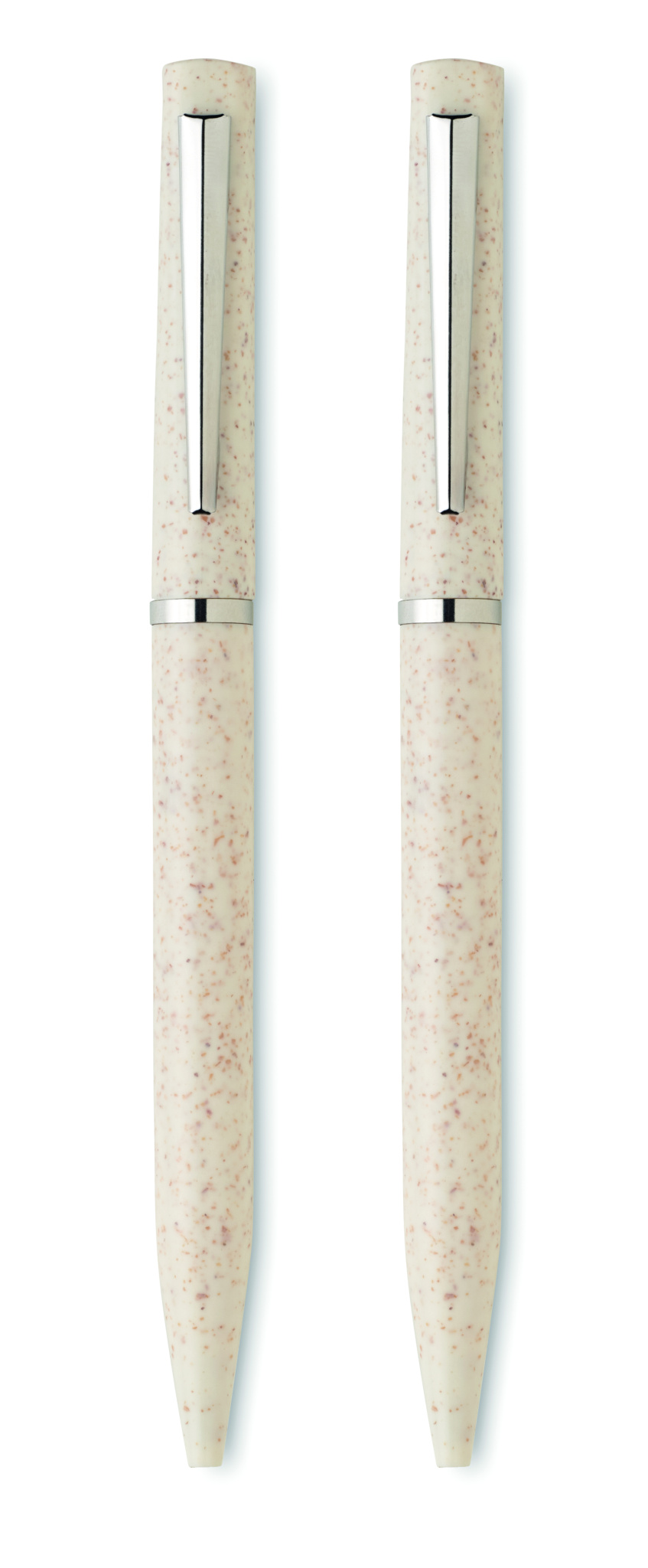 Wheat straw/ABS pen set with 1 twist ball pen blue ink and 1 twist graphite inkless ball pen. Presented in recycled paper box.