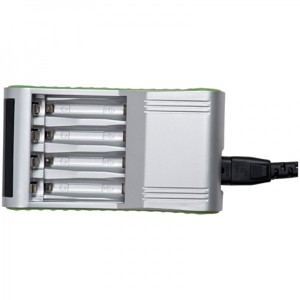 Это зарядное устройство для аккумуляторов — настоящая инновация. Вы можете заряжать и повторно использовать до 4 щелочных аккумуляторов (AA / AAA Alkaline) или даже NiMH-аккумуляторы в течение двух часов. Включает вилку питания. Мы печатаем ваш логотип на серебряной поверхности.