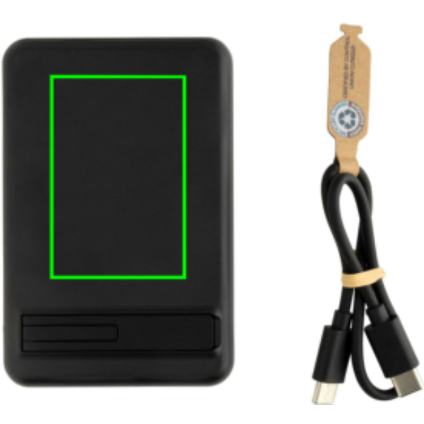 Карманный внешний аккумулятор емкостью 5000 мАч с магнитным беспроводным зарядным устройством 5 Вт с корпусом из сертифицированного RCS переработанного АБС-пластика и сертифицированного FSC бамбука. RCS (стандарт утверждения о переработке) — это стандарт для проверки содержания переработанных материалов в продукте по всей цепочке поставок. Общее содержание переработанных материалов: 22 % от общего веса товара. Внешний аккумулятор содержит долговечный литий-полимерный аккумулятор класса А емкостью 5000 мАч. Со встроенной подставкой для телефона. Индикаторы питания покажут оставшийся уровень энергии, поэтому вы всегда будете знать, когда следует подзарядить.; Вход Type-C 5 В/2,4 А; Выход Type C: 5 В/2 А,4 А. Товар и аксессуары не содержат ПВХ. В комплект входит сертифицированный RCS переработанный кабель для зарядки TPE. Упаковано в упаковку FSC® mix.