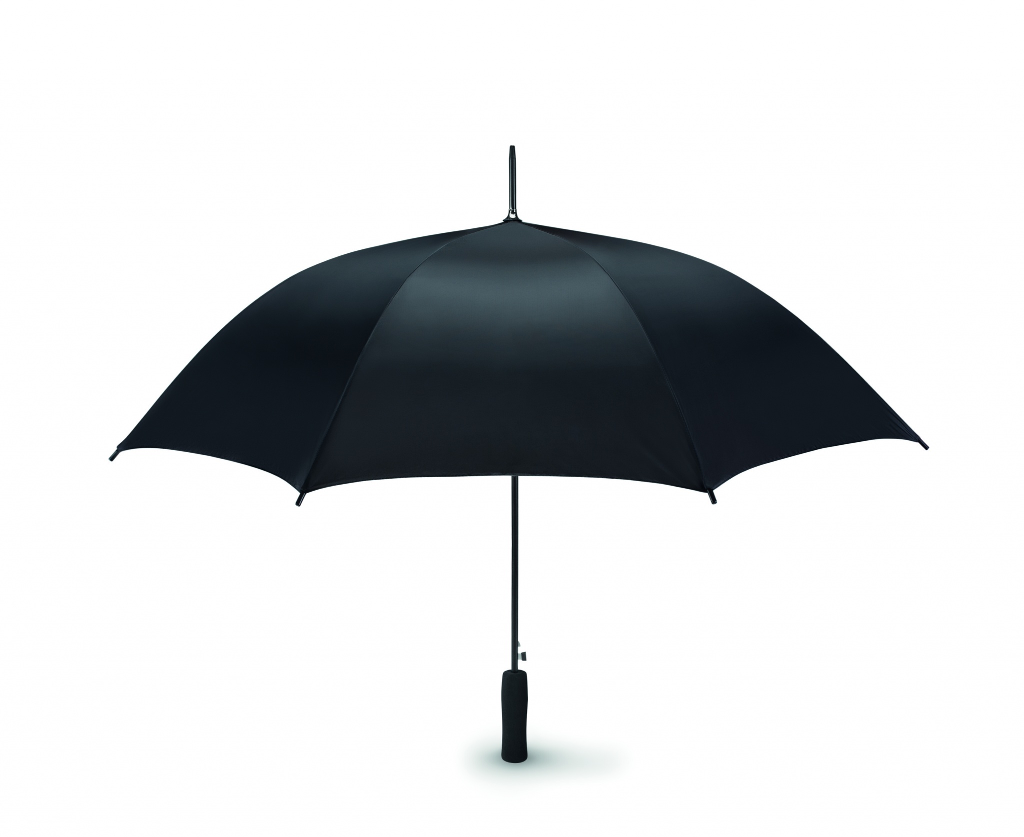 Зонт полуавтомат устойчивый к ветру с черным металлическим стержнем и черной пластиковой ручкой. Открытый купол диаметром Ø 103см