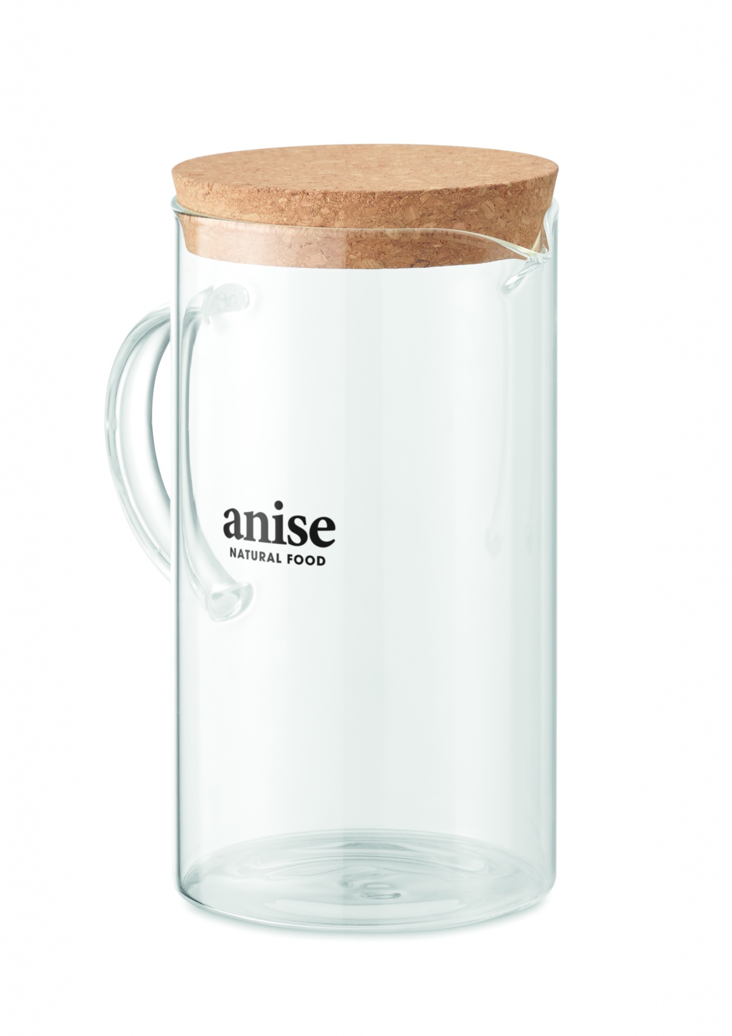 Karaff i borosilikatglas med korklock. Servera färskgjord juice, saft, vatten eller andra drycker i denna glaskanna. Eftersom det är tillverkat av borosilikatglas tål den varm eller kall dryck. Korklocket ger karaffen ett naturligt utseende. Volym: 1L.