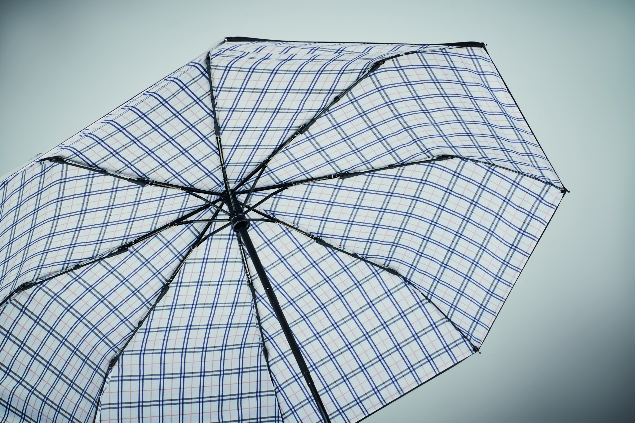 23 tum 3-delat, automatiskt öppnings-/stängningsbart, stormsäkert kompakt paraply i dubbellager 190T pongee med rutmönster på insidan. Tvådelat svartpläterad skaft. Svarta glasfiber ribbor med nickelpläterad mittdel. Böjt gummerat handtag i ABS.