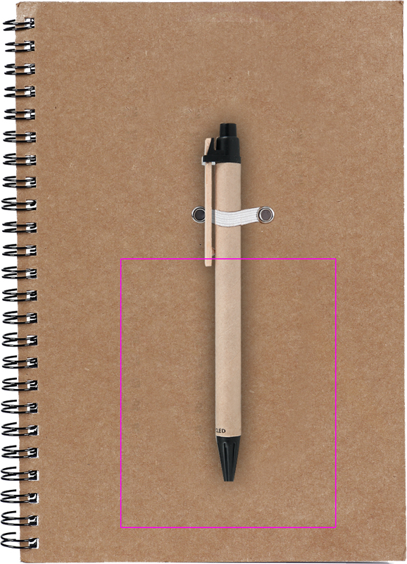 A5 skrivblock av återvunnen kartong och papper med 120 raderade sidor och en kulpenna med blått bläck av återvunnen kartong. Vi trycker din logotyp på omslaget.