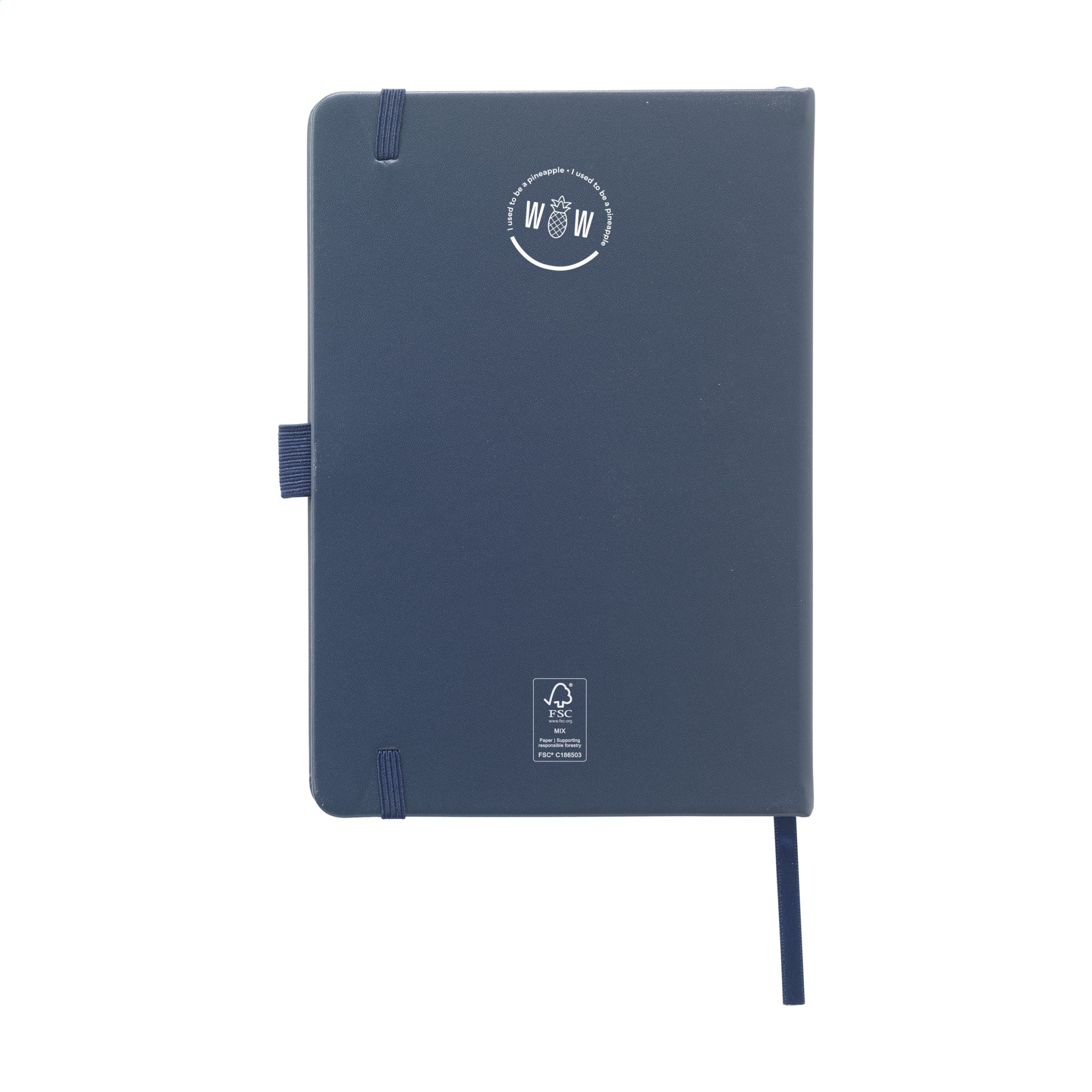 WoW! A5-anteckningsbok med hårt omslag gjord av ananas-imitation. Detta material är tillverkat av 30 % återvunna ananaskomponenter. Den här anteckningsboken har ca. 80 ark/160 sidor vitt, fodrat FSC Mix-certifierat papper (80 g/m²) och är utrustad med en elastisk stängning, en inbunden rygg, pennögla och läsband. Det veganska konstlädret är praktiskt taget omöjligt att skilja från äkta läder. Materialet är dock gjort av ananasblad, en restprodukt från ananasodling. Av denna anledning behövs inga ytterligare ämnen, såsom vatten, gödning eller bekämpningsmedel för dess produktion. Fibrerna i ananasbladen tvättas, berikas med PU och torkas i ugnen. Resultatet? Smidiga ark av vegansk konstläder, som sedan förses med en vacker finish. Efter torkning skapas ett mjukt och attraktivt material med egenskaperna hos läder. Den består dels av fruktrester och dels av PU.