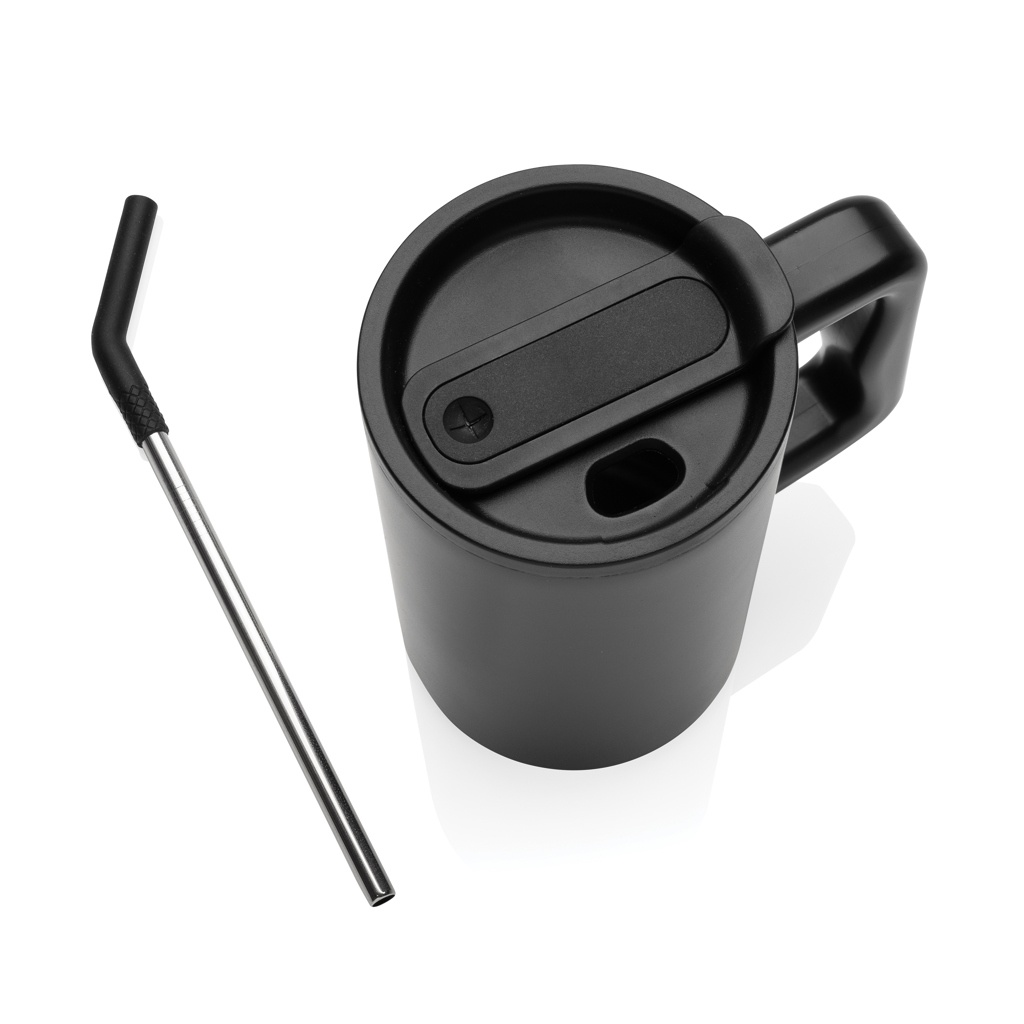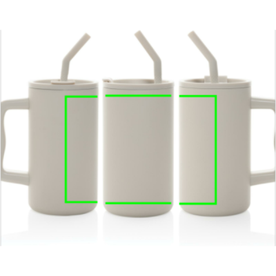 Njut av den robusta omfamningen av vår generöst tilltagna 800 ml. mugg - rejäl och perfekt för skrivbordet på kontoret. Det robusta handtaget och den breda basen gör den till en idealisk följeslagare för ditt dagliga vattenintag på kontoret. Muggen är tillverkad av hållbart återvunnet rostfritt stål och är utformad för att tillgodose dina vätskebehov. Den rejäla, dubbelväggiga, vakuumisolerade muggen är utrustad med ett säkert lock, sugrör och en sugrörsspets i silikon. Skruvlocket är mångsidigt nog för både varma och iskalla drycker och har en dubbel funktion - en praktisk drickpip eller möjlighet att använda sugrör. För optimal skötsel rekommenderar vi att du handdiskar denna rejäla mugg.