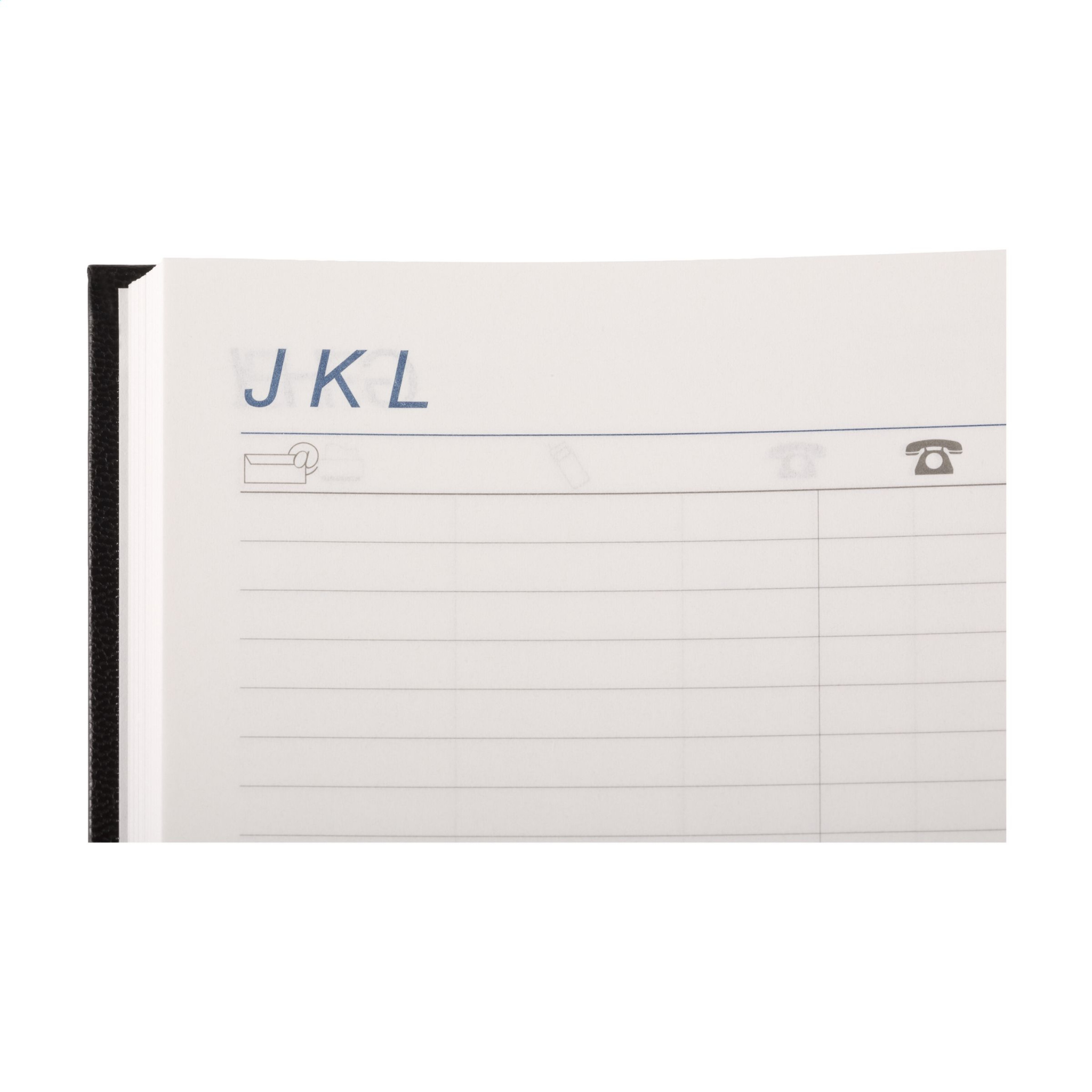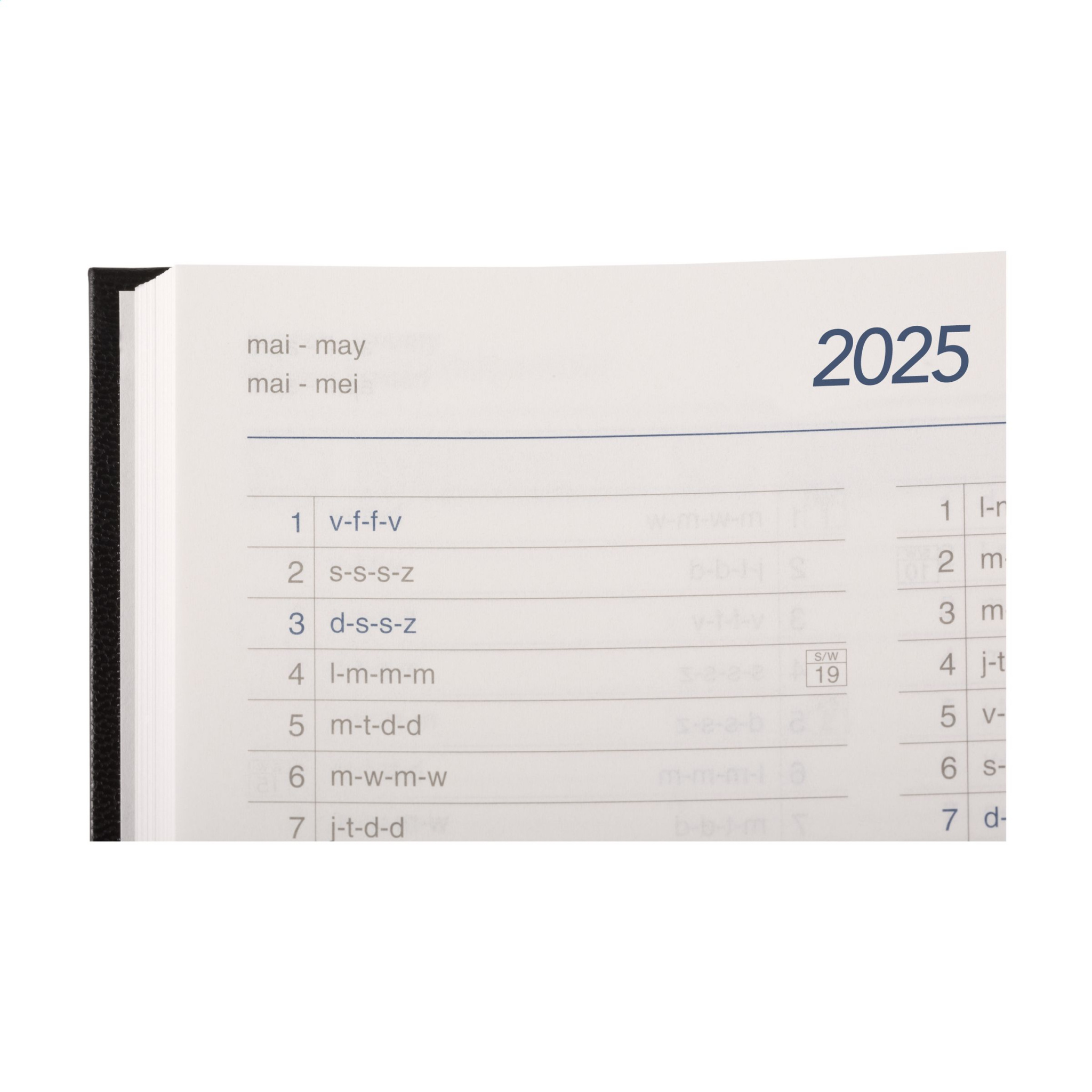 Kontorsdagbok på fyra språk: EN, NL, F och D. Med hållbart vadderat Balacron-omslag och årtal präglad på framsidan. 80 g vitt, FSC Mix-certifierat papper, stor veckoöversikt över två sidor, 2 färgtryck, trådbunden, veckoöversikt på två sidor, årsplanerare innevarande år och nästa år, extra användbar information. Nära A5 storlek.