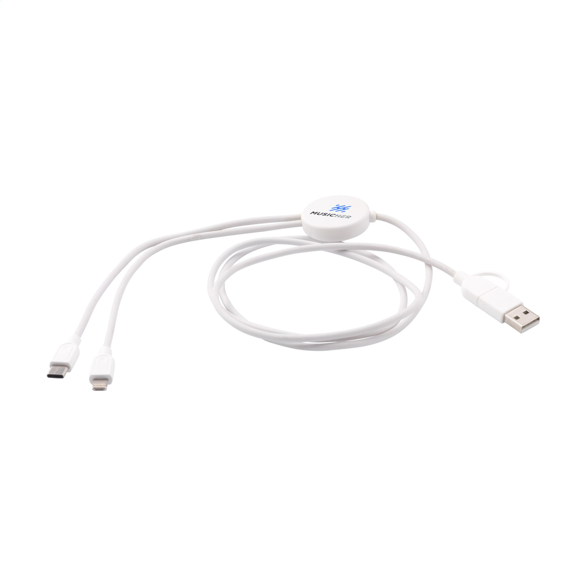 Laddkabel tillverkad av återvunnen ABS och återvunnen TPE. Ingång: Typ-C och USB-A-kontakt. Utgång: Type-C och Lightning. RCS-certifierad. Totalt återvunnet material: 62%. Kabellängd: 120 cm. Varje artikel levereras i ett individuellt kuvert.
