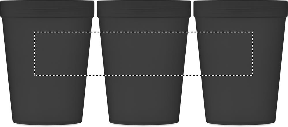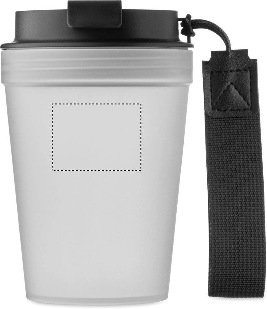 Enkelväggig take-away mugg i PP, med band i RPET-polyester. Läckagefri. Volym: 300 ml. Eftersom det här är en enkelväggig mugg kan värmeöverföring fortfarande förekomma.