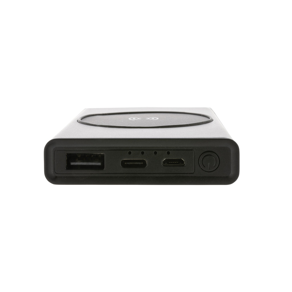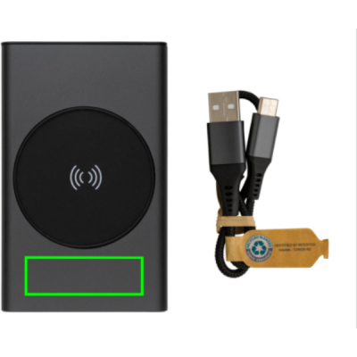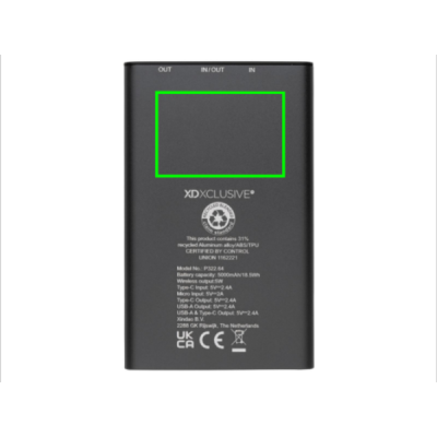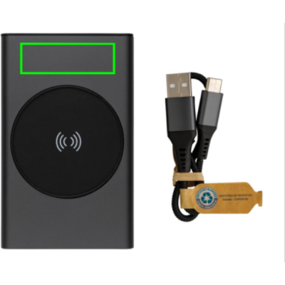 Powerbank tillverkad av RCS (Recycled Claim Standard) certifierad återvunnen aluminium och ABS. Totalt återvunnet innehåll: 31% baserat på total produktvikt. RCS certifiering säkerställer en helt certifierad leveranskedja av de återvunna materialen. Aluminium förlorar inte sina egenskaper i återvinningsprocessen och kan återvinnas i det oändliga. Powerbanken har ett långvarigt A-graderat 5.000 mAh lithium polymer batteri. Den trådlösa laddningen stödjer trådlös laddning upp till 5W. Strömindikatorn visar energinivån så att du vet när det är dags att ladda på nytt. Produkt och accessoarer är 100% PVC-fria. Type C laddningskabel i RCS certifierad återvunnen aluminium, TPE och PET medföljer. Levereras i FSC® mix förpackning. USB output 5/2.4A, Type C output: 5V/2.4A. Type C input: 2.4A. Micro USB input: 5V/2A.
