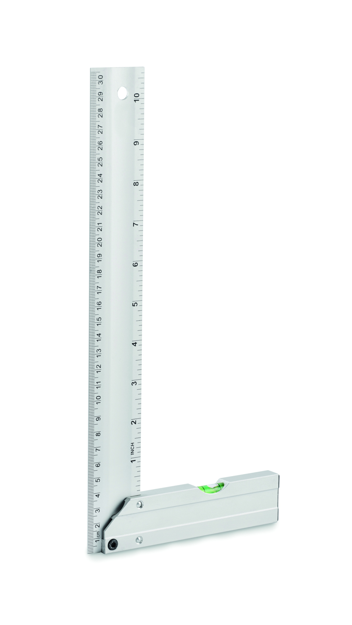 Vinkelhake i aluminium med vattenpass. Linjal 30 cm.