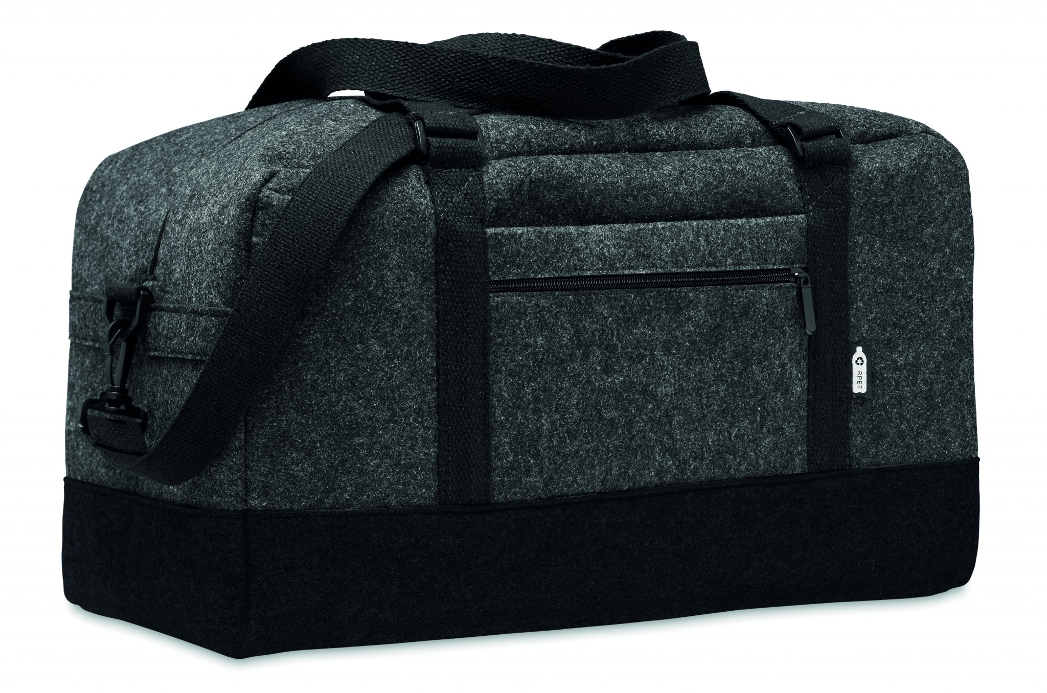 Weekend- eller träningsväska i RPET-filtväska för med dragkedja på framsidan, handtag av canvas och avtagbar justerbar axelrem.